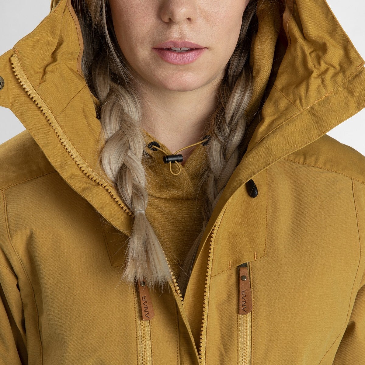 - Dreifach verstellbare Sturmkapuze: elastischer Kordelzug vorne an der Kapuze und quer über die Kapuze sowie Kordelzug hinten. Ein Metallring in der vorderen Klappe an der Kapuze ermöglicht es, die Form der Kapuze nach Bedarf anzupassen.