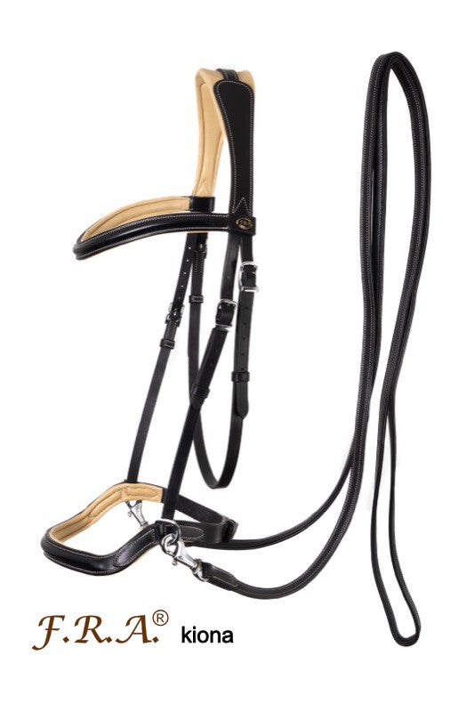 Entwickelt mit Sorgfalt für das Wohlergehen des Pferdes. Das F.R.A. Kiona kombiniert einen eleganten Look mit einem anatomisch geformten Design, das perfekt zur natürlichen Form des Pferdekopfes passt. Das Genickstück, das Vorder- und das Nasenband sind mit einer weichen Polsterung in Cremefarbe versehen, die für eine feine Druckverteilung sorgt und dem Zaumzeug ein schickes Aussehen verleiht. Die weichen Lederzügel vervollständigen dieses Zaumzeug aus hochwertigen Materialien.